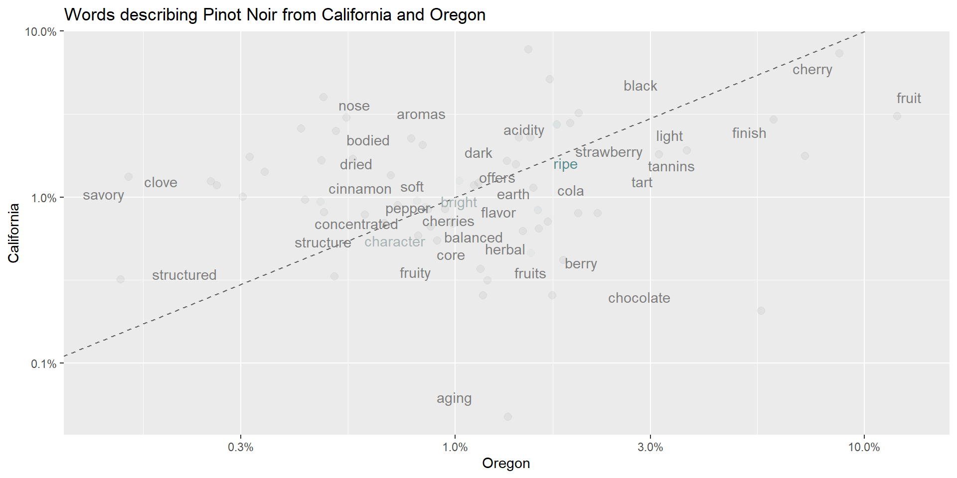 labs(x = "Oregon", y = "California", title = "Words describing Pinot Noir from California and Oregon")
