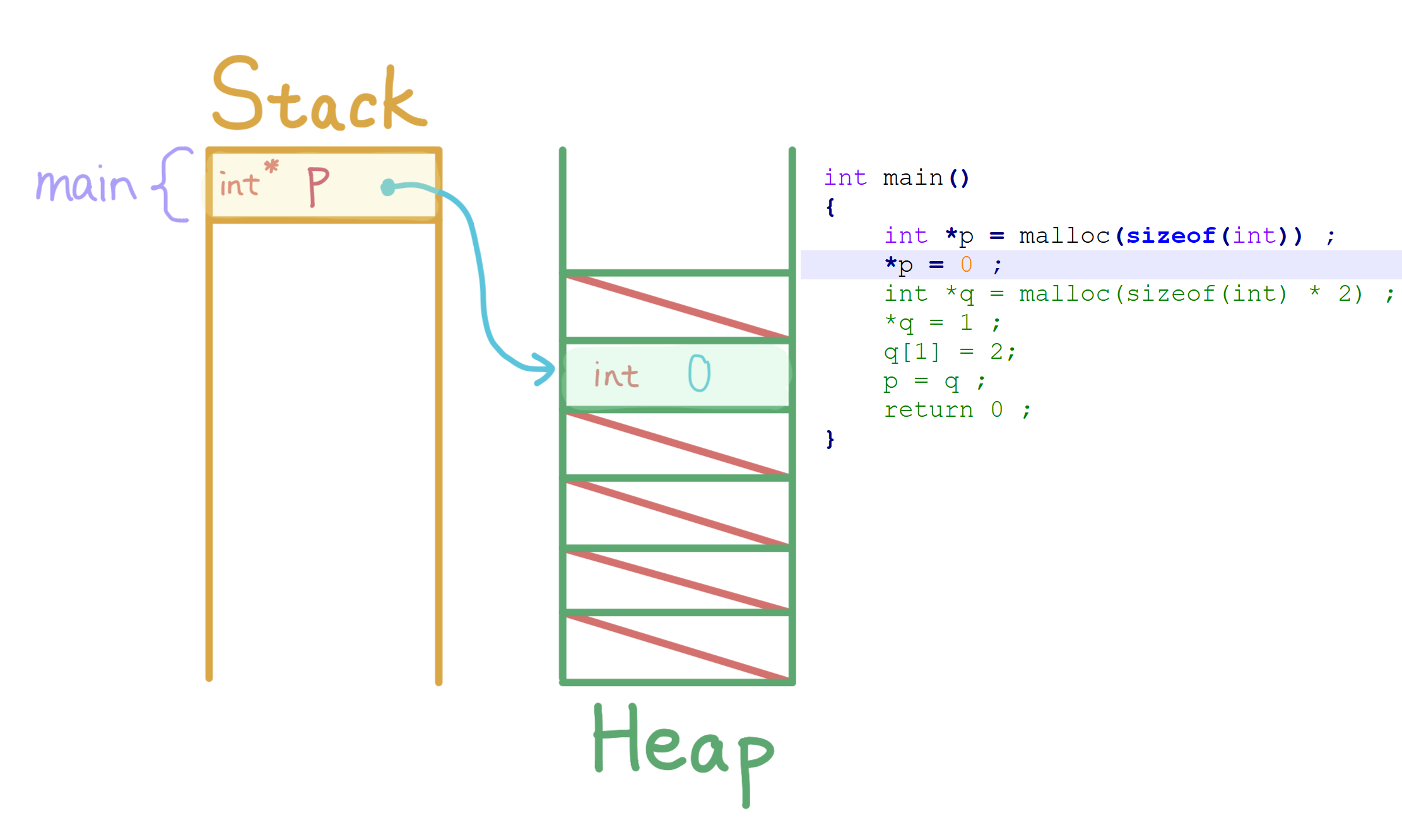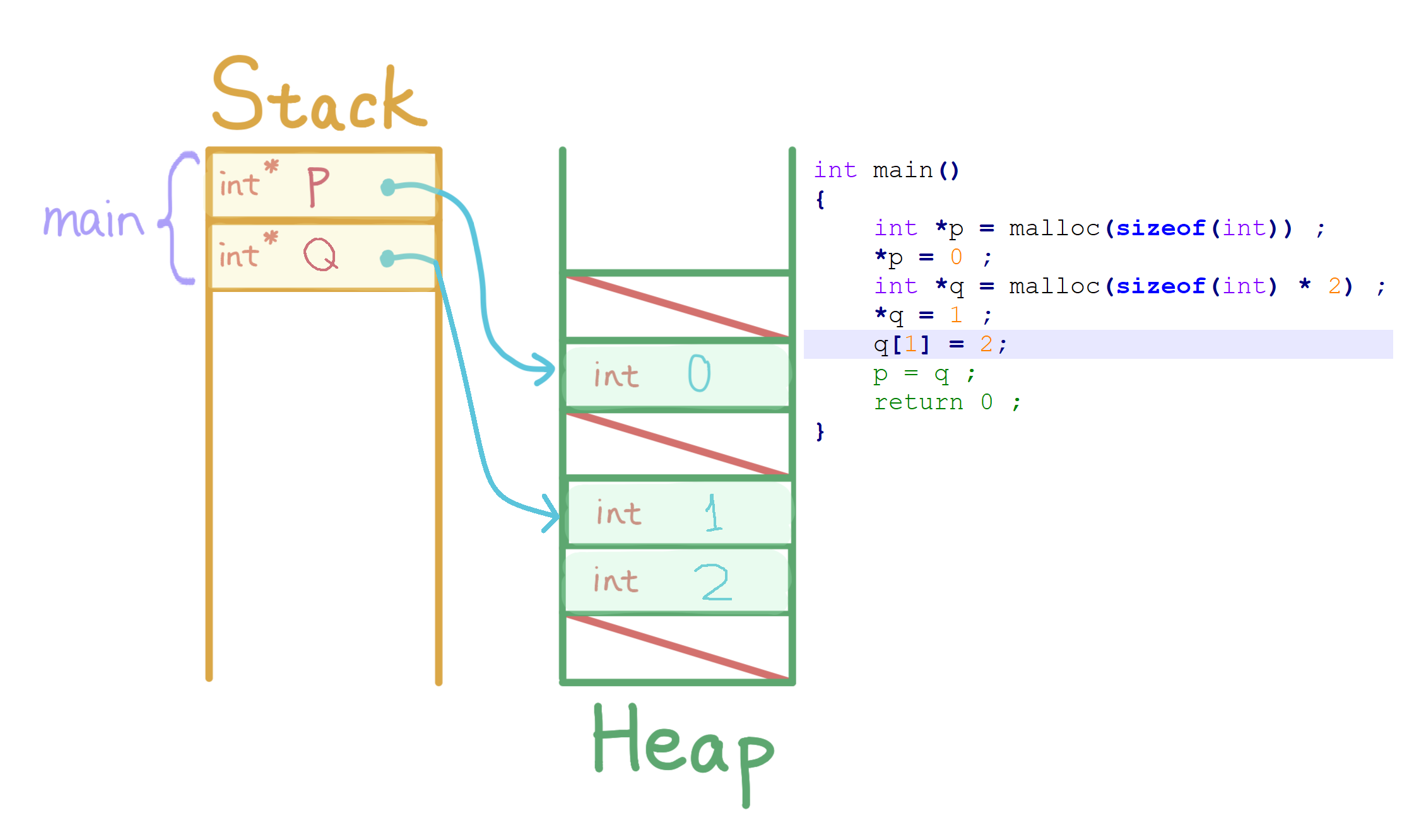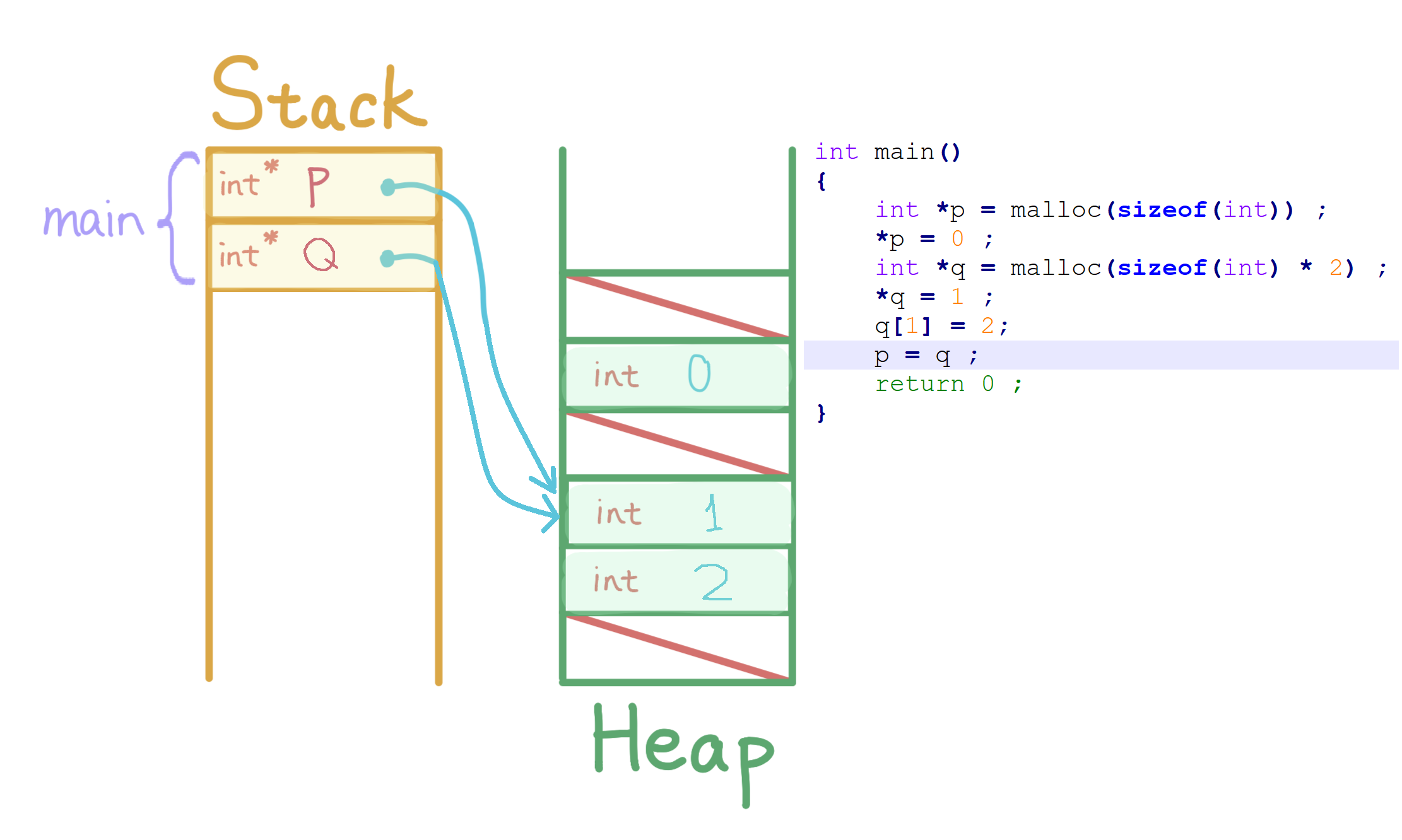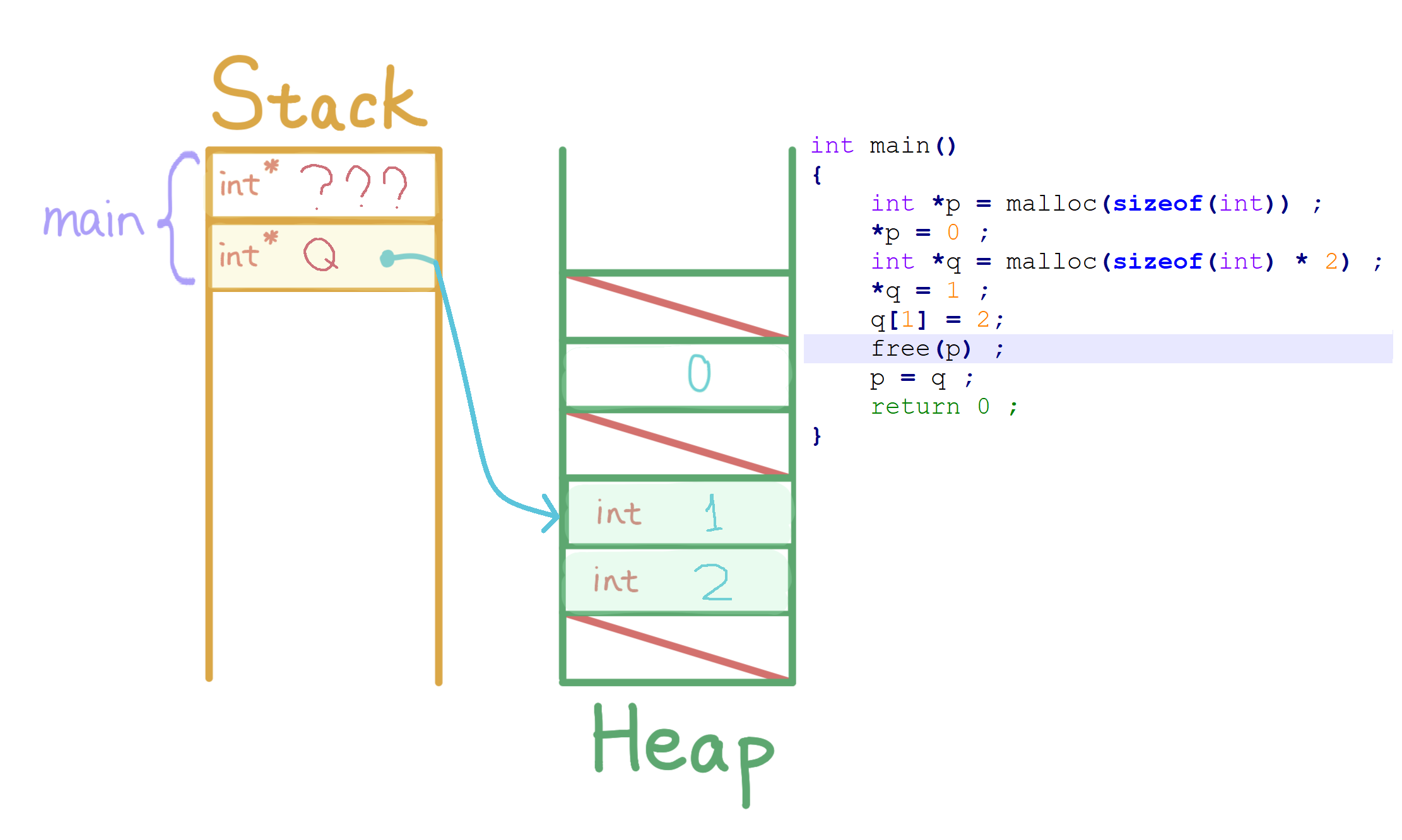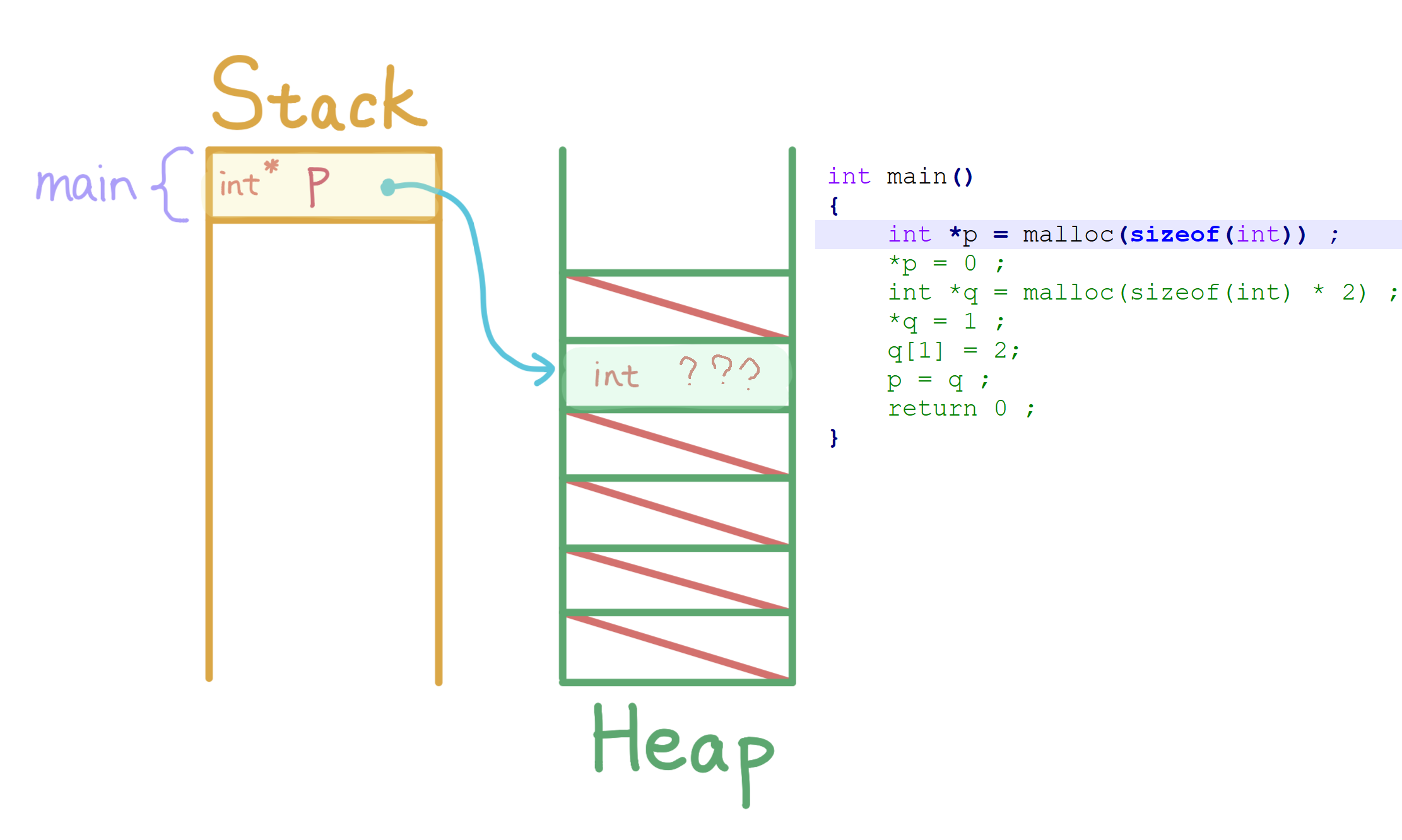 int *p = malloc(sizeof(int)), *q, i ;