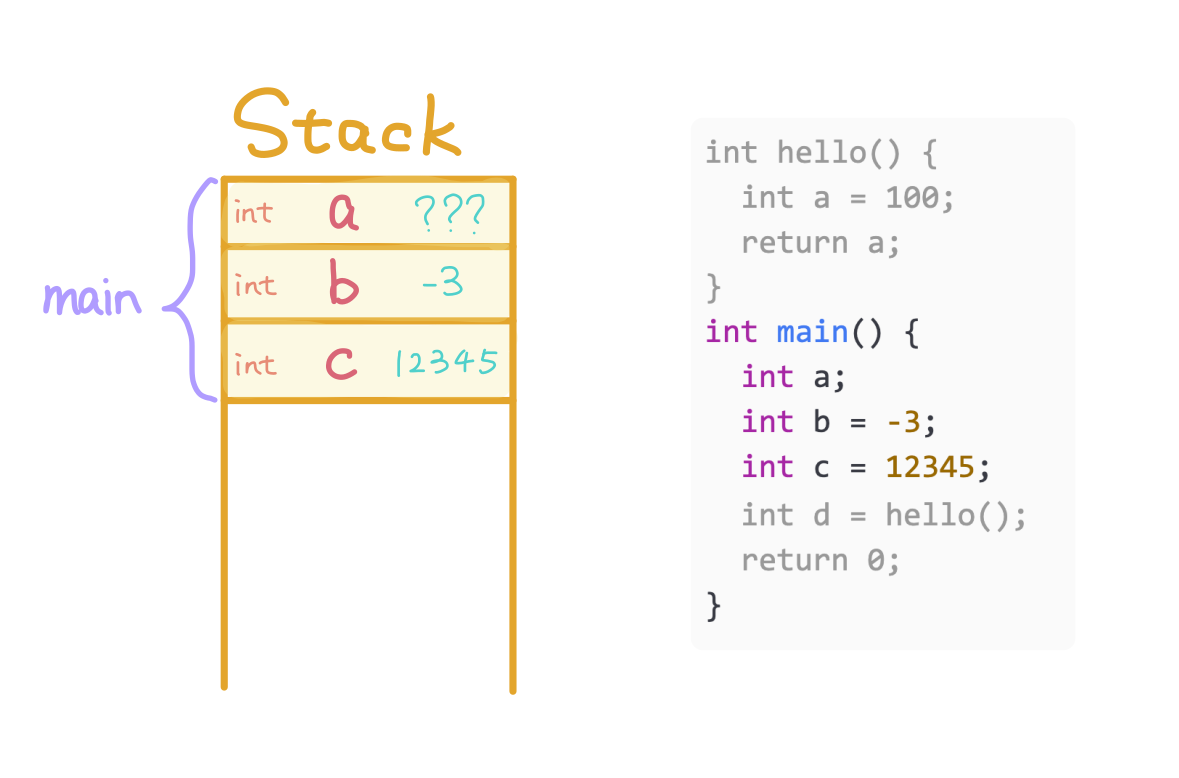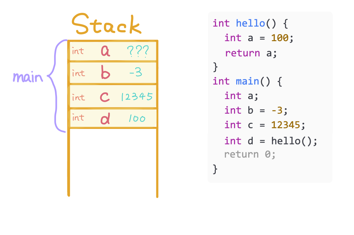 a for mainsizeof(int) bytes for variable b for function main