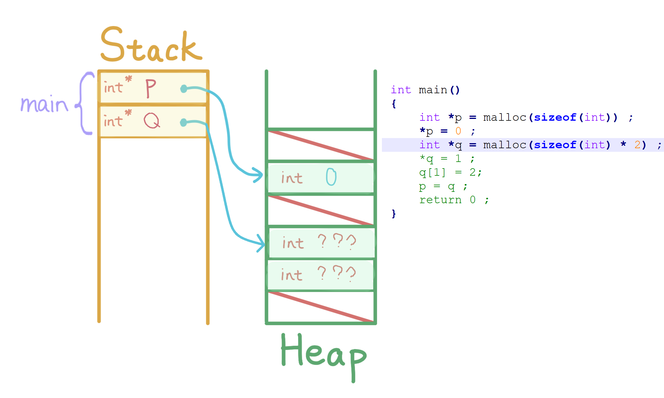 malloc in your code should have a corresponding freep” forgotten!1 you left in “old p” forever!free(p) and the bytes return to circulation.0 persists until overwritten*valgrind