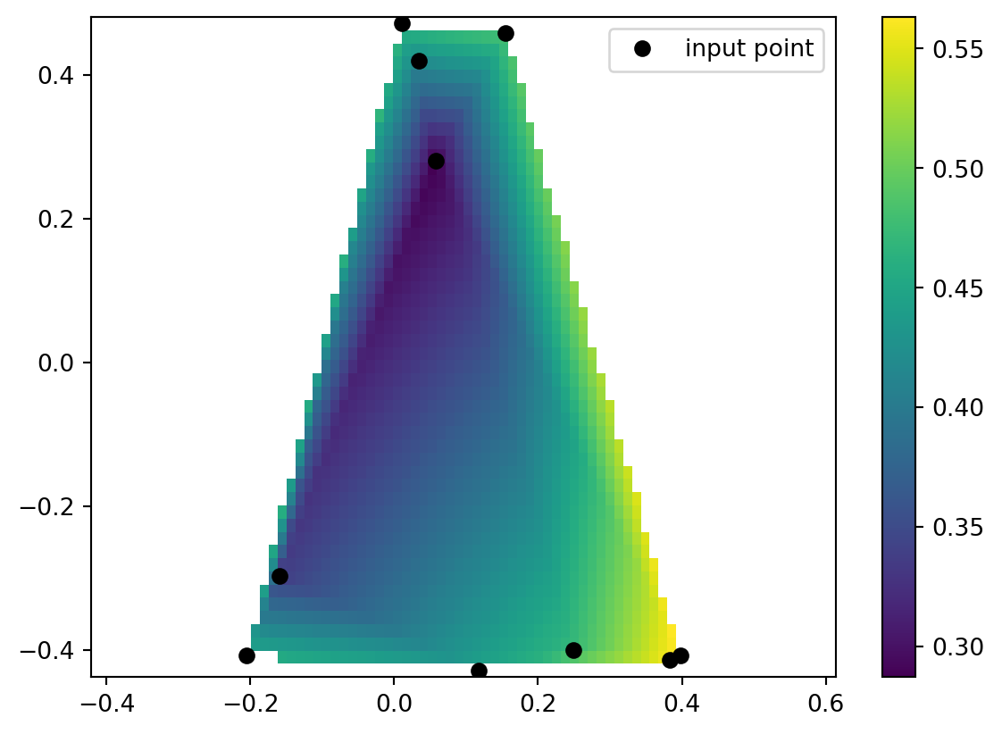 LinearNDInterpolatortakes an array of known inputs and an array of known outputs and returns a function that it thinks describes the relationship.- “Thinks” being a vague term here to convey a sense of learning or prediction or estimation.